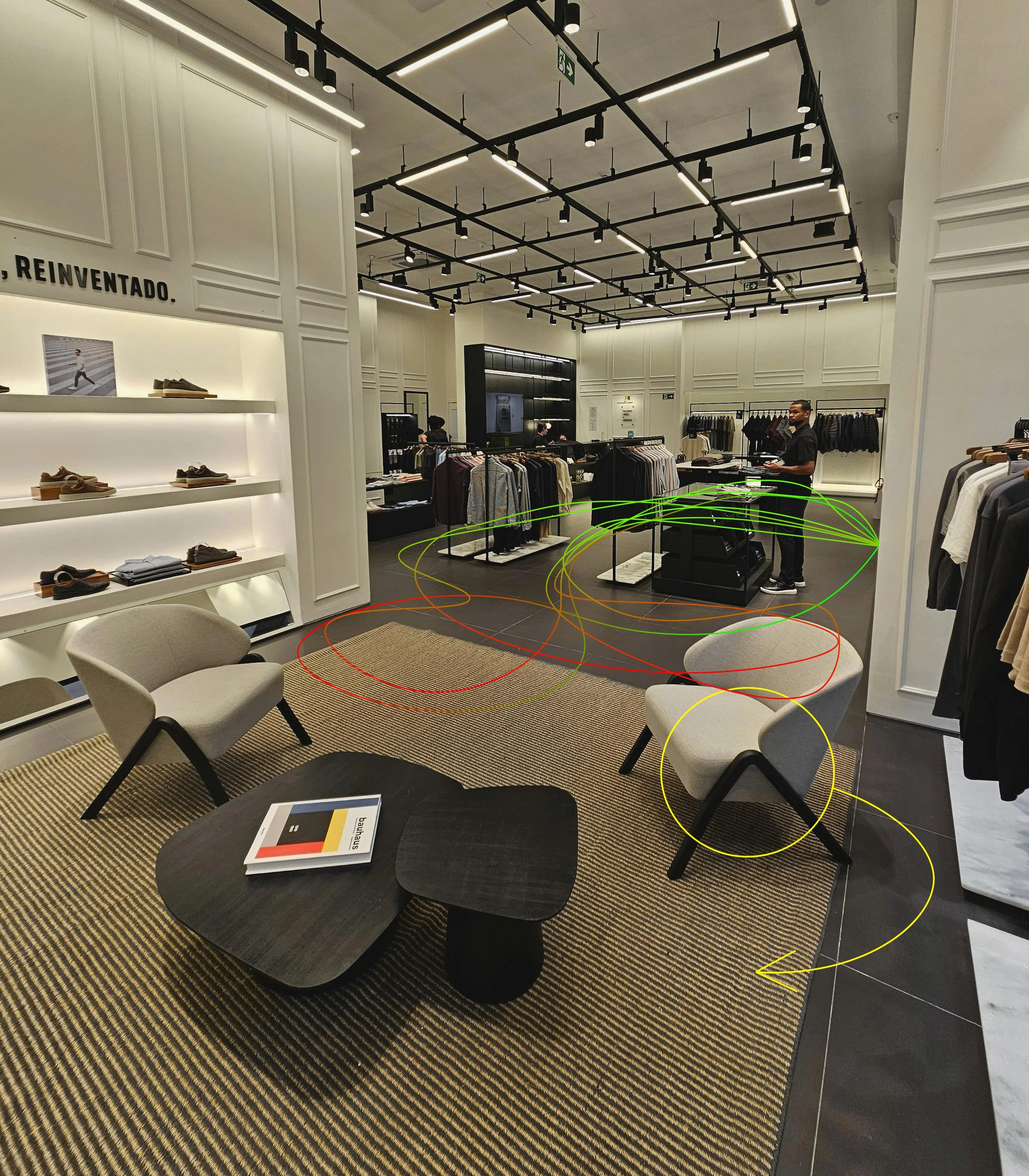 Interior de una tienda de ropa moderna con área de sillones y una mesa, exhibición de calzado y ropa en las estanterías, un empleado atendiendo al fondo.