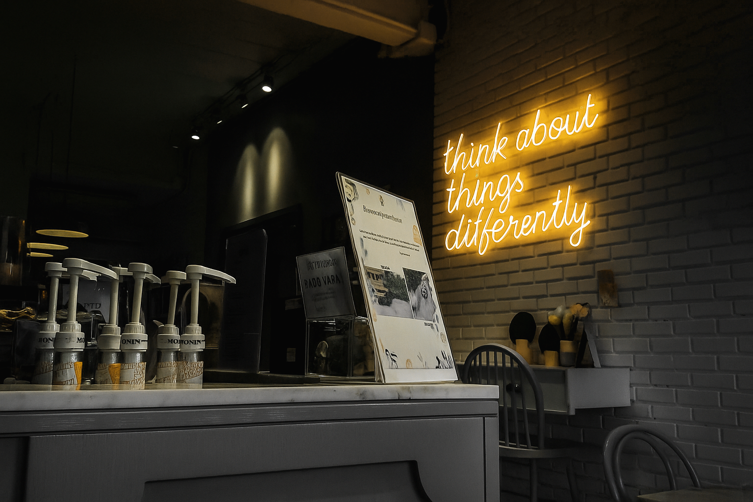 Interior de una cafetería con cartel de luces LED con la frase 'think about things differently', una mesa con varias botellas de monín y un cartel de menú al fondo.