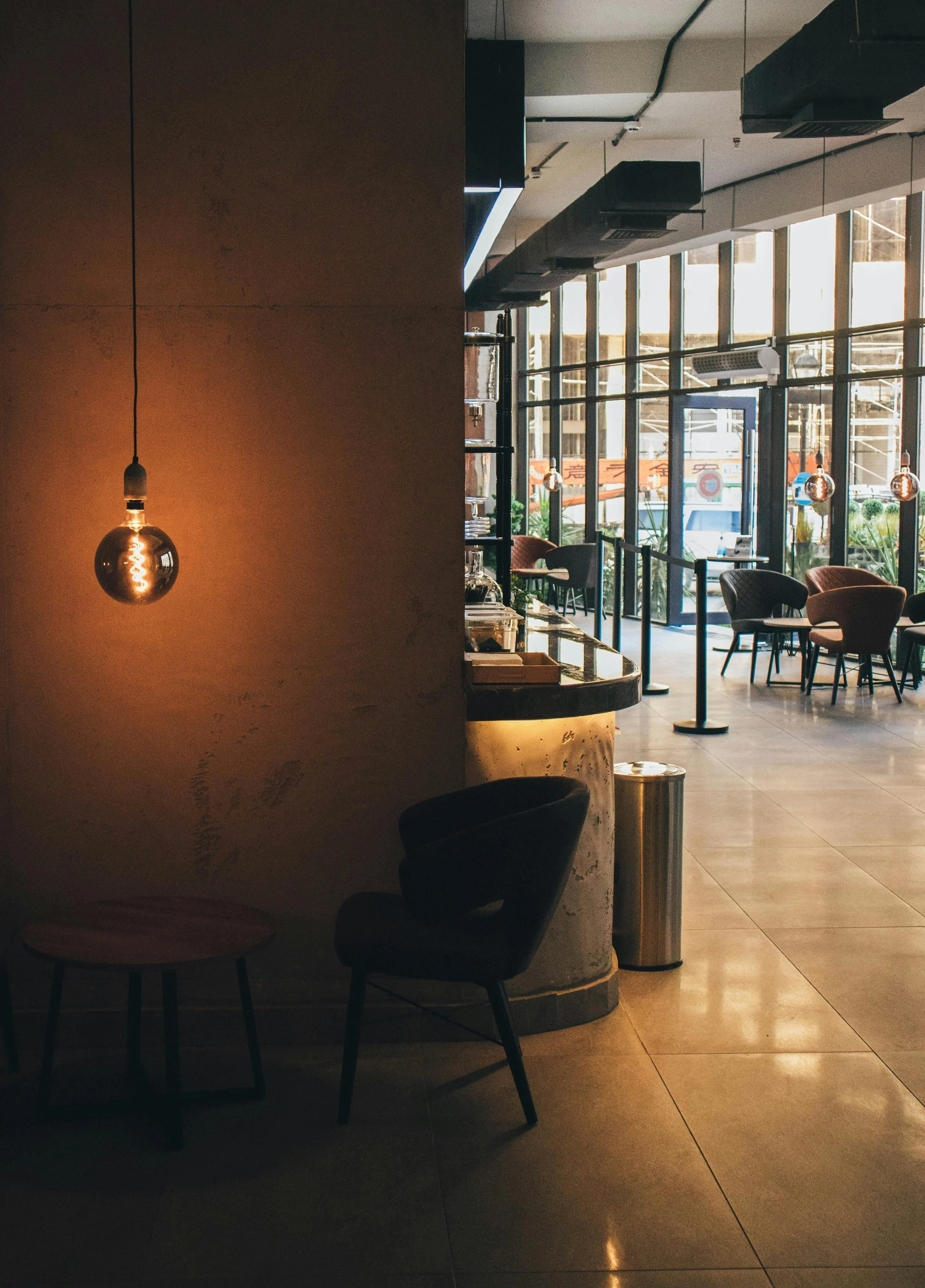 Interior de cafetería moderna con sillones, mesas y ventanas grandes que dejan entrar luz natural.